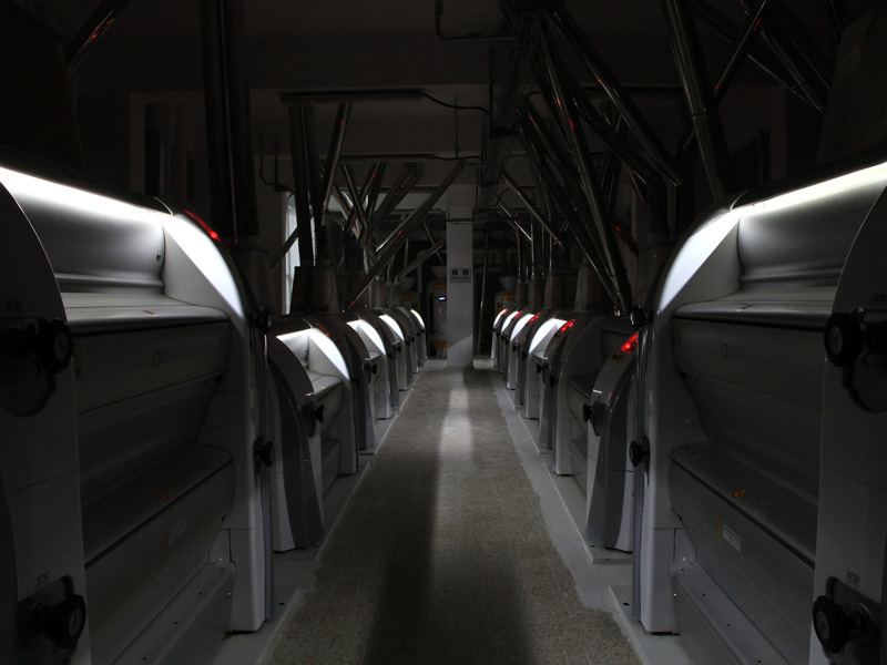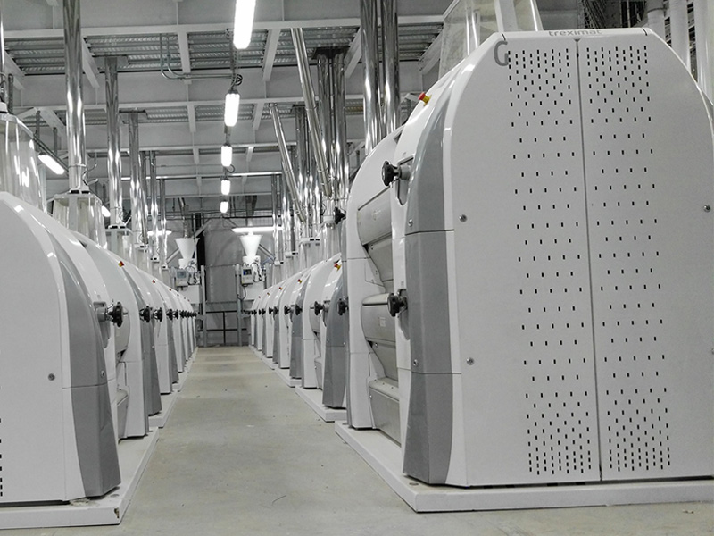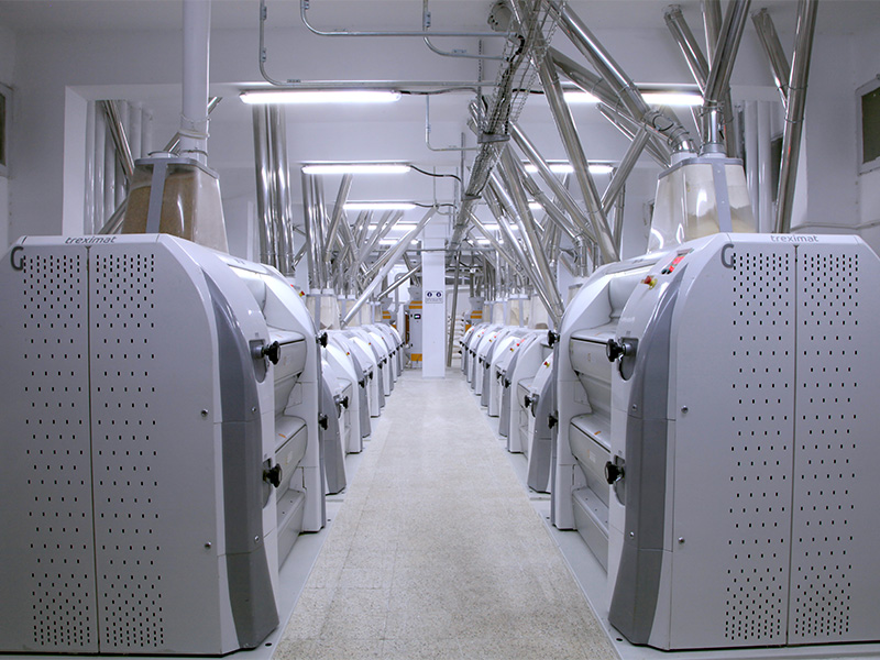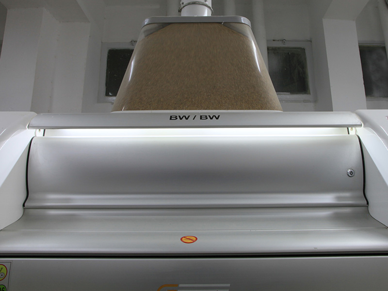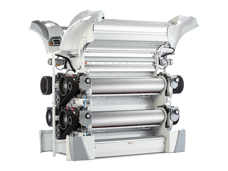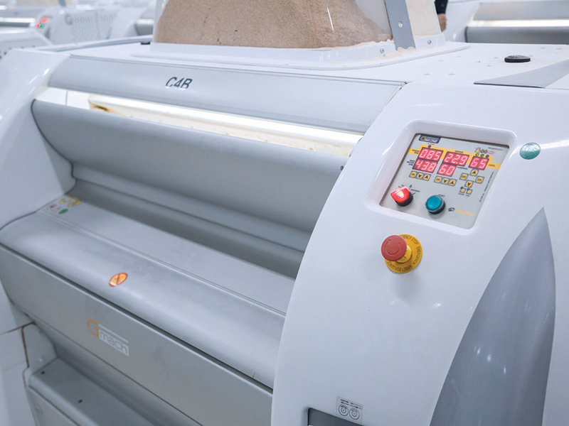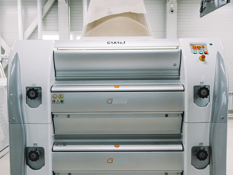 The grain enters the roller mill through product inlet hopper, from which it is conveyed to the feeder rolls and then to the milling rolls. Capacitive level sensors or loadcells adjust amount of the grain which is placed in the product inlet hopper. A pneumatic system is used for the automatic engagement/disengagement of the milling rolls and for adjusting milling distance, using a graduated hand-operated Wheel.